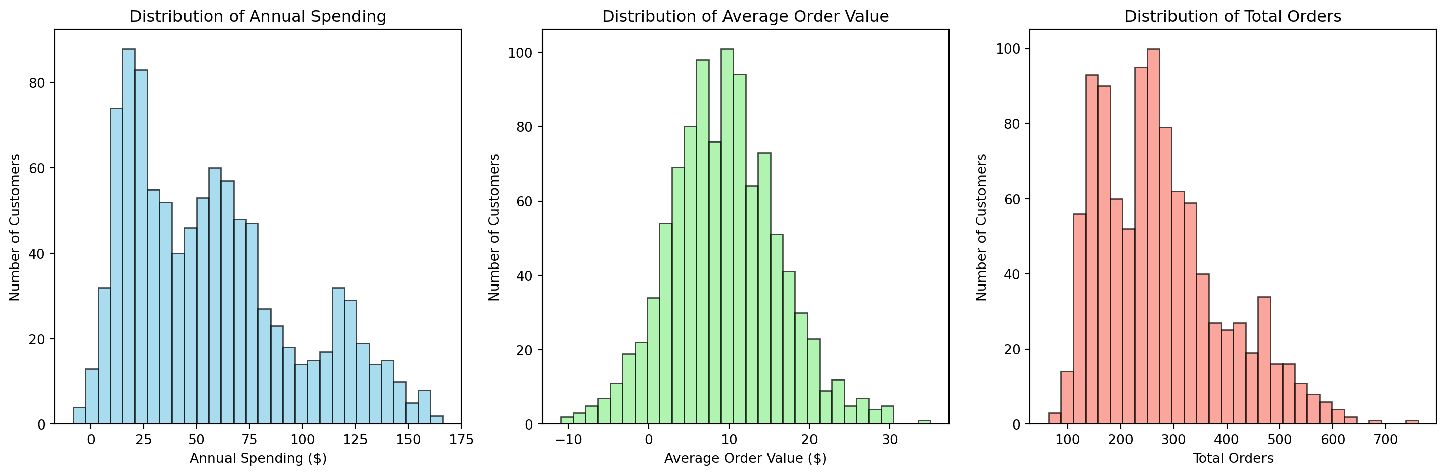 fig, axes = plt.subplots(1, 3, figsize=(15, 5))# Annual Spendingaxes[0].hist(df['Annual_Spending'], bins=30, alpha=0.7, color='skyblue', edgecolor='black')axes[0].set_title('Distribution of Annual Spending')axes[0].set_xlabel('Annual Spending ($)')axes[0].set_ylabel('Number of Customers')# Average Order Valueaxes[1].hist(df['Avg_Order_Value'], bins=30, alpha=0.7, color='lightgreen', edgecolor='black')axes[1].set_title('Distribution of Average Order Value')axes[1].set_xlabel('Average Order Value ($)')axes[1].set_ylabel('Number of Customers')# Total Ordersaxes[2].hist(df['Total_Orders'], bins=30, alpha=0.7, color='salmon', edgecolor='black')axes[2].set_title('Distribution of Total Orders')axes[2].set_xlabel('Total Orders')axes[2].set_ylabel('Number of Customers')plt.tight_layout()plt.show()