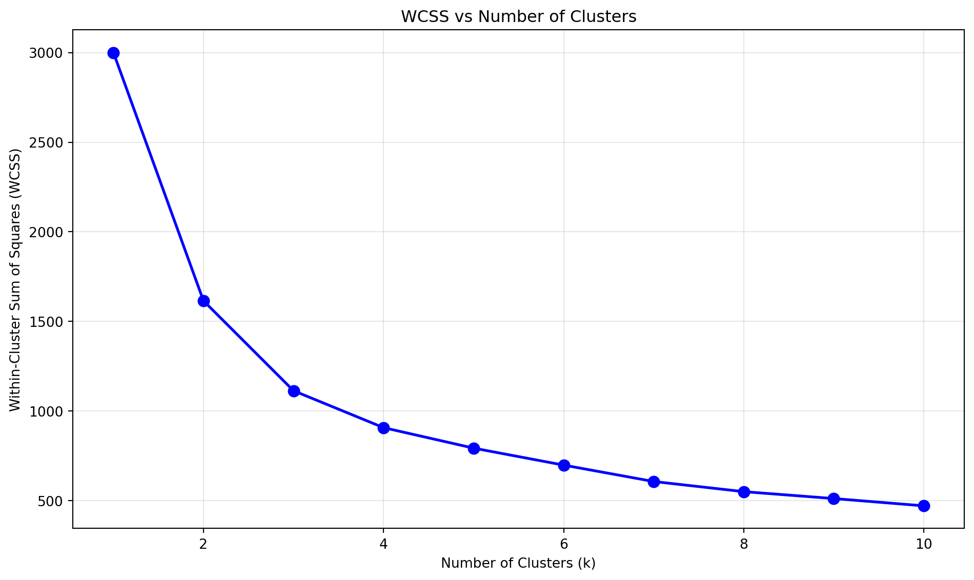 import numpy as npimport matplotlib.pyplot as pltfrom sklearn.datasets import make_blobs# Set random seed for reproducibilitynp.random.seed(42)# Generate sample datan_samples =300X, _ = make_blobs(n_samples=n_samples, centers=3, cluster_std=3.00, random_state=2)# Initialize centroids randomlyk =3centroids = X[np.random.choice(n_samples, k, replace=False)]# Function to assign points to clustersdef assign_clusters(X, centroids): distances = np.sqrt(((X - centroids[:, np.newaxis])**2).sum(axis=2))return np.argmin(distances, axis=0)# Function to update centroidsdef update_centroids(X, labels, k):return np.array([X[labels == i].mean(axis=0) for i inrange(k)])# Function to calculate within-cluster sum of squaresdef calculate_wcss(X, labels, centroids):returnsum(np.sum((X[labels == i] - centroids[i])**2) for i inrange(k))# Set up the clustering progress plotfig1, axs = plt.subplots(2, 3, figsize=(10, 6))axs = axs.ravel()# Colors for each clustercolors = ['#1f77b4', '#ff7f0e', '#2ca02c']# List to store WCSS valueswcss_values = []# Run k-means iterations and plotfor i inrange(6):# Assign clusters labels = assign_clusters(X, centroids)# Calculate WCSS wcss = calculate_wcss(X, labels, centroids) wcss_values.append(wcss)# Plot the current clustering state axs[i].scatter(X[:, 0], X[:, 1], c=[colors[l] for l in labels], alpha=0.6) axs[i].scatter(centroids[:, 0], centroids[:, 1], c='red', marker='x', s=200, linewidths=3) axs[i].set_title(f'Iteration {i if i <5else"Final"}, WCSS: {wcss:.2f}') axs[i].set_xlim(X[:, 0].min() -1, X[:, 0].max() +1) axs[i].set_ylim(X[:, 1].min() -1, X[:, 1].max() +1)# Update centroids (except for the last iteration)if i <5: centroids = update_centroids(X, labels, k)plt.tight_layout()# Create a separate plot for WCSS progressfig2, ax = plt.subplots(figsize=(10, 6))ax.plot(range(6), wcss_values, marker='o')ax.set_title('WCSS Progress')ax.set_xlabel('Iteration')ax.set_ylabel('Within-Cluster Sum of Squares')ax.grid(True)plt.tight_layout()plt.show()