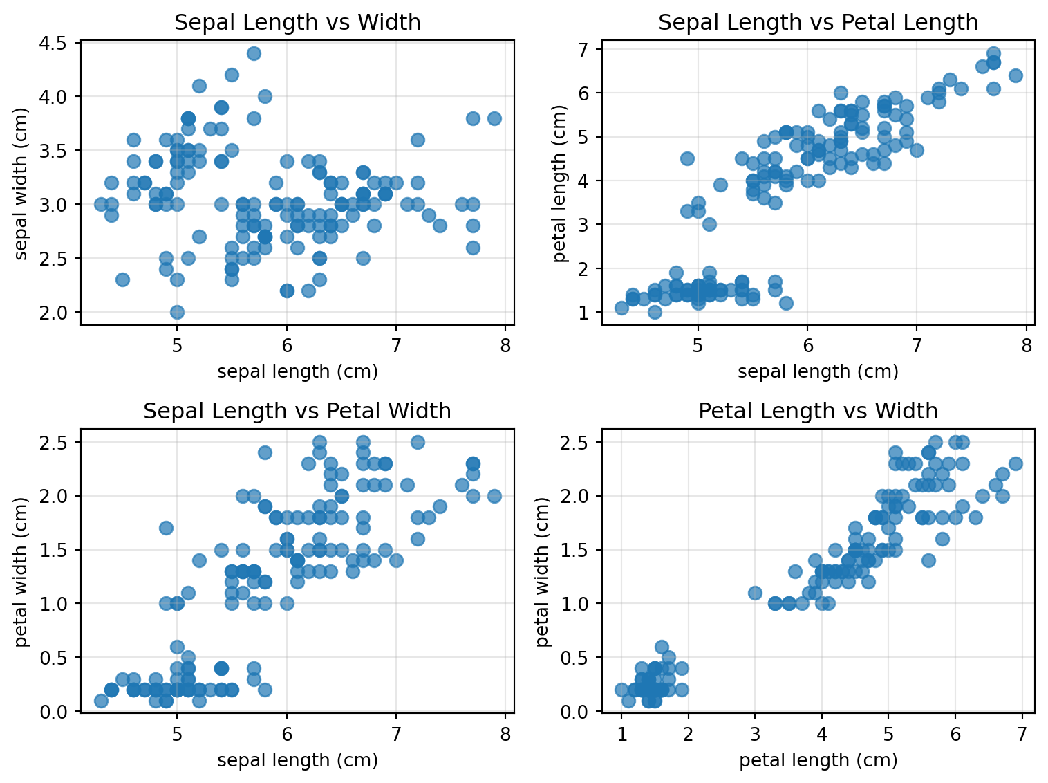 fig, axes = plt.subplots(2, 2, figsize=(8, 6))axes = axes.ravel()# Plot all pairwise combinations of featuresfeature_pairs = [(0, 1), (0, 2), (0, 3), (2, 3)]titles = ['Sepal Length vs Width', 'Sepal Length vs Petal Length', 'Sepal Length vs Petal Width', 'Petal Length vs Width']for i, (feat1, feat2) inenumerate(feature_pairs): axes[i].scatter(X[:, feat1], X[:, feat2], alpha=0.7, s=50) axes[i].set_xlabel(feature_names[feat1]) axes[i].set_ylabel(feature_names[feat2]) axes[i].set_title(titles[i]) axes[i].grid(True, alpha=0.3)plt.tight_layout()plt.show()