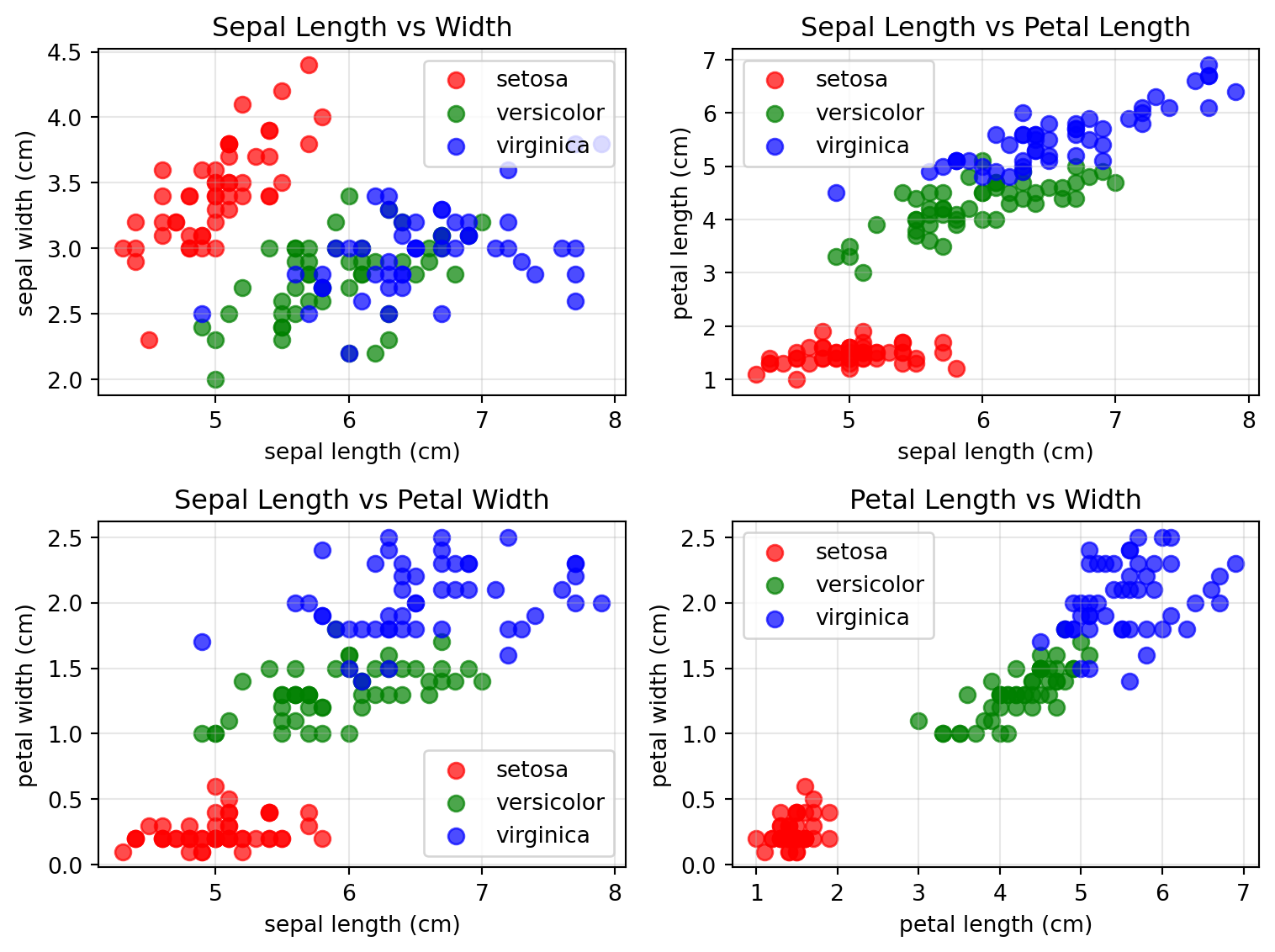 fig, axes = plt.subplots(2, 2, figsize=(8, 6))axes = axes.ravel()# Color mapping for speciescolors = ['red', 'green', 'blue']# Plot all pairwise combinations of featuresfeature_pairs = [(0, 1), (0, 2), (0, 3), (2, 3)]titles = ['Sepal Length vs Width', 'Sepal Length vs Petal Length', 'Sepal Length vs Petal Width', 'Petal Length vs Width']for i, (feat1, feat2) inenumerate(feature_pairs):for species inrange(3): mask = y == species axes[i].scatter(X[mask, feat1], X[mask, feat2], c=colors[species], label=target_names[species], alpha=0.7, s=50) axes[i].set_xlabel(feature_names[feat1]) axes[i].set_ylabel(feature_names[feat2]) axes[i].set_title(titles[i]) axes[i].legend() axes[i].grid(True, alpha=0.3)plt.tight_layout()plt.show()
