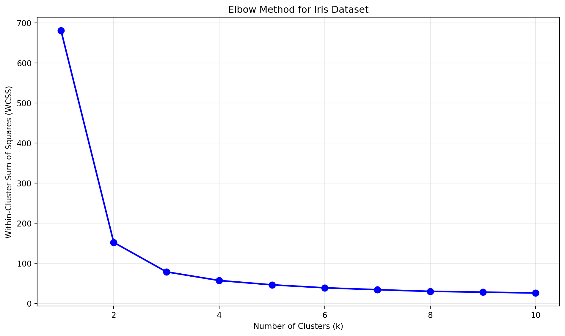 from sklearn.cluster import KMeansimport matplotlib.pyplot as pltimport numpy as np# Calculate WCSS for different numbers of clusterswcss = []K_range =range(1, 11)for k in K_range: kmeans = KMeans(n_clusters=k, random_state=42, n_init=10) kmeans.fit(X) wcss.append(kmeans.inertia_)# Plot the elbow curveplt.figure(figsize=(10, 6))plt.plot(K_range, wcss, 'bo-', linewidth=2, markersize=8)plt.title('Elbow Method for Iris Dataset')plt.xlabel('Number of Clusters (k)')plt.ylabel('Within-Cluster Sum of Squares (WCSS)')plt.grid(True, alpha=0.3)plt.tight_layout()plt.show()