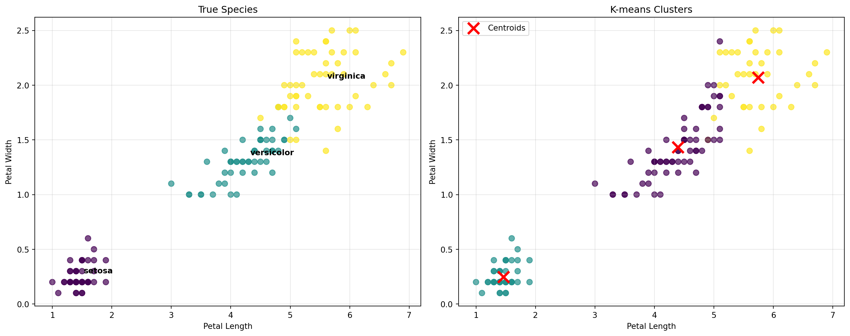 from sklearn.cluster import KMeansfrom sklearn.metrics import adjusted_rand_score, confusion_matriximport seaborn as sns# Perform k-means clustering with k=3 (we know there are 3 species)kmeans = KMeans(n_clusters=3, random_state=42, n_init=10)cluster_labels = kmeans.fit_predict(X)# Create confusion matrixcm = confusion_matrix(y, cluster_labels)# Convert to DataFrame for better visualizationcm_df = pd.DataFrame(cm, index=target_names, columns=[f'Cluster {i}'for i inrange(3)])print(f"\nConfusion Matrix:")print("Rows: True species, Columns: Predicted clusters")print(cm_df)# Visualize clustering results in 2Dfig, axes = plt.subplots(1, 2, figsize=(15, 6))# Plot 1: True speciesscatter1 = axes[0].scatter(X[:, 2], X[:, 3], c=y, cmap='viridis', alpha=0.7, s=50)axes[0].set_xlabel('Petal Length')axes[0].set_ylabel('Petal Width')axes[0].set_title('True Species')axes[0].grid(True, alpha=0.3)# Add species labelsfor i, species inenumerate(target_names): mask = y == i centroid_x = X[mask, 2].mean() centroid_y = X[mask, 3].mean() axes[0].annotate(species, (centroid_x, centroid_y), xytext=(5, 5), textcoords='offset points', fontsize=10, fontweight='bold')# Plot 2: K-means clustersscatter2 = axes[1].scatter(X[:, 2], X[:, 3], c=cluster_labels, cmap='viridis', alpha=0.7, s=50)axes[1].scatter(kmeans.cluster_centers_[:, 2], kmeans.cluster_centers_[:, 3], c='red', marker='x', s=200, linewidths=3, label='Centroids')axes[1].set_xlabel('Petal Length')axes[1].set_ylabel('Petal Width')axes[1].set_title(f'K-means Clusters')axes[1].legend()axes[1].grid(True, alpha=0.3)plt.tight_layout()plt.show()