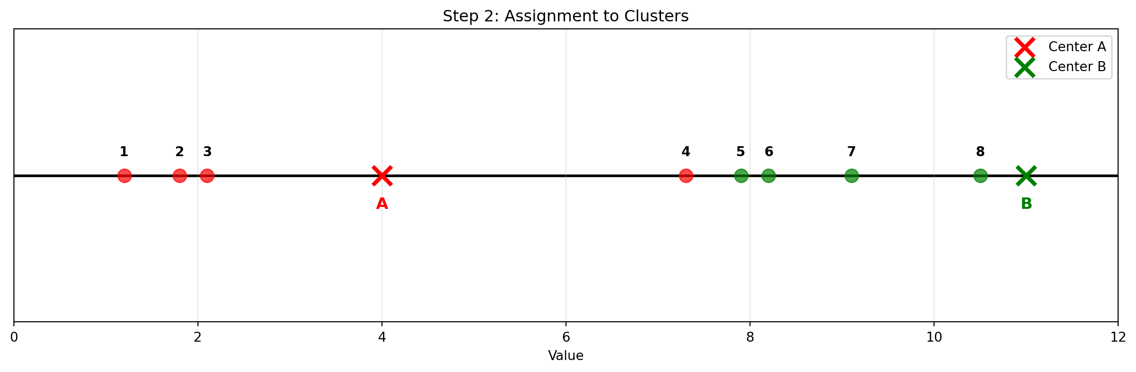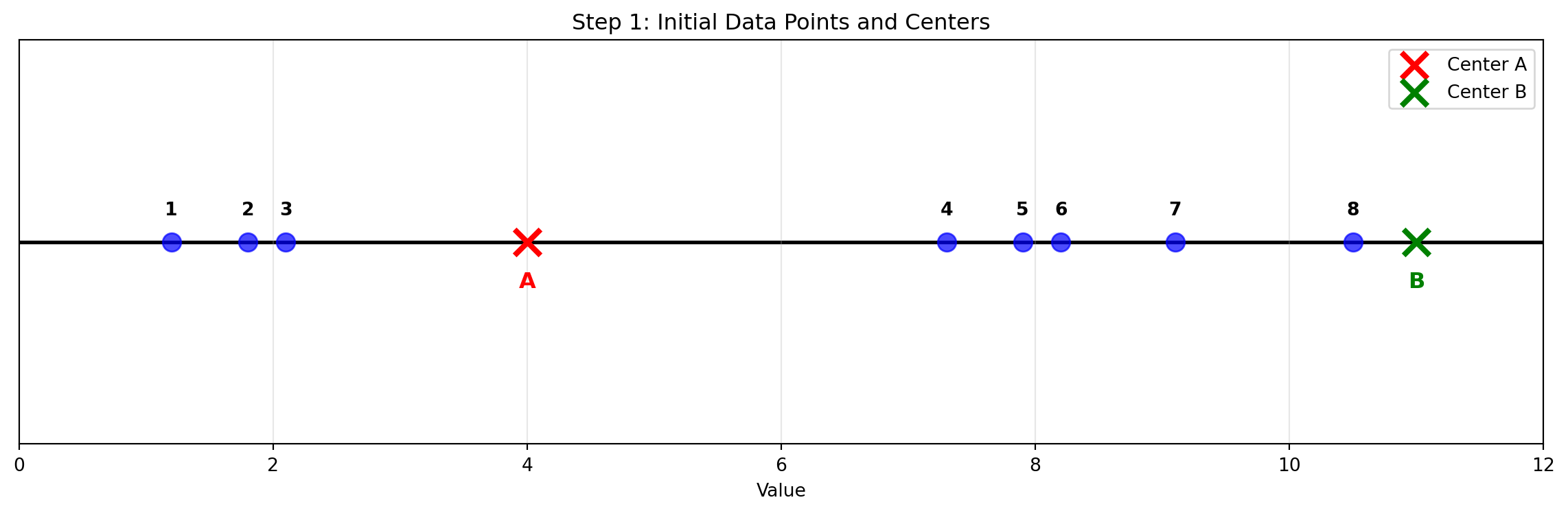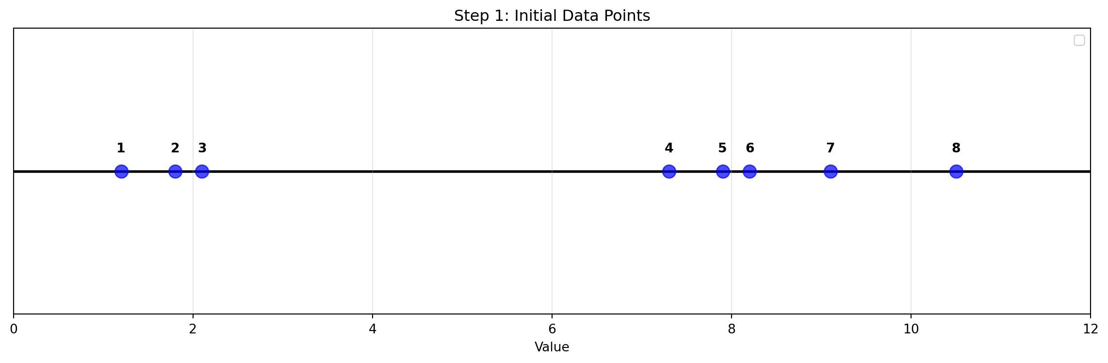 # Data pointsdata_points = np.array([1.2, 1.8, 2.1, 7.3, 7.9, 8.2, 9.1, 10.5])# Create the plotfig, ax = plt.subplots(figsize=(12, 4))# Plot data points with numbersfor i, point inenumerate(data_points): ax.scatter(point, 0, s=100, c='blue', alpha=0.7, zorder=3) ax.annotate(f'{i+1}', (point, 0), xytext=(0, 15), textcoords='offset points', ha='center', fontsize=10, fontweight='bold')# Add horizontal x-axis lineax.axhline(y=0, color='black', linewidth=2, zorder=1)# Formattingax.set_xlim(0, 12)ax.set_ylim(-0.5, 0.5)ax.set_xlabel('Value')ax.set_title('Step 1: Initial Data Points')ax.grid(True, alpha=0.3)ax.set_yticks([])ax.legend(loc='upper right')plt.tight_layout()plt.show()