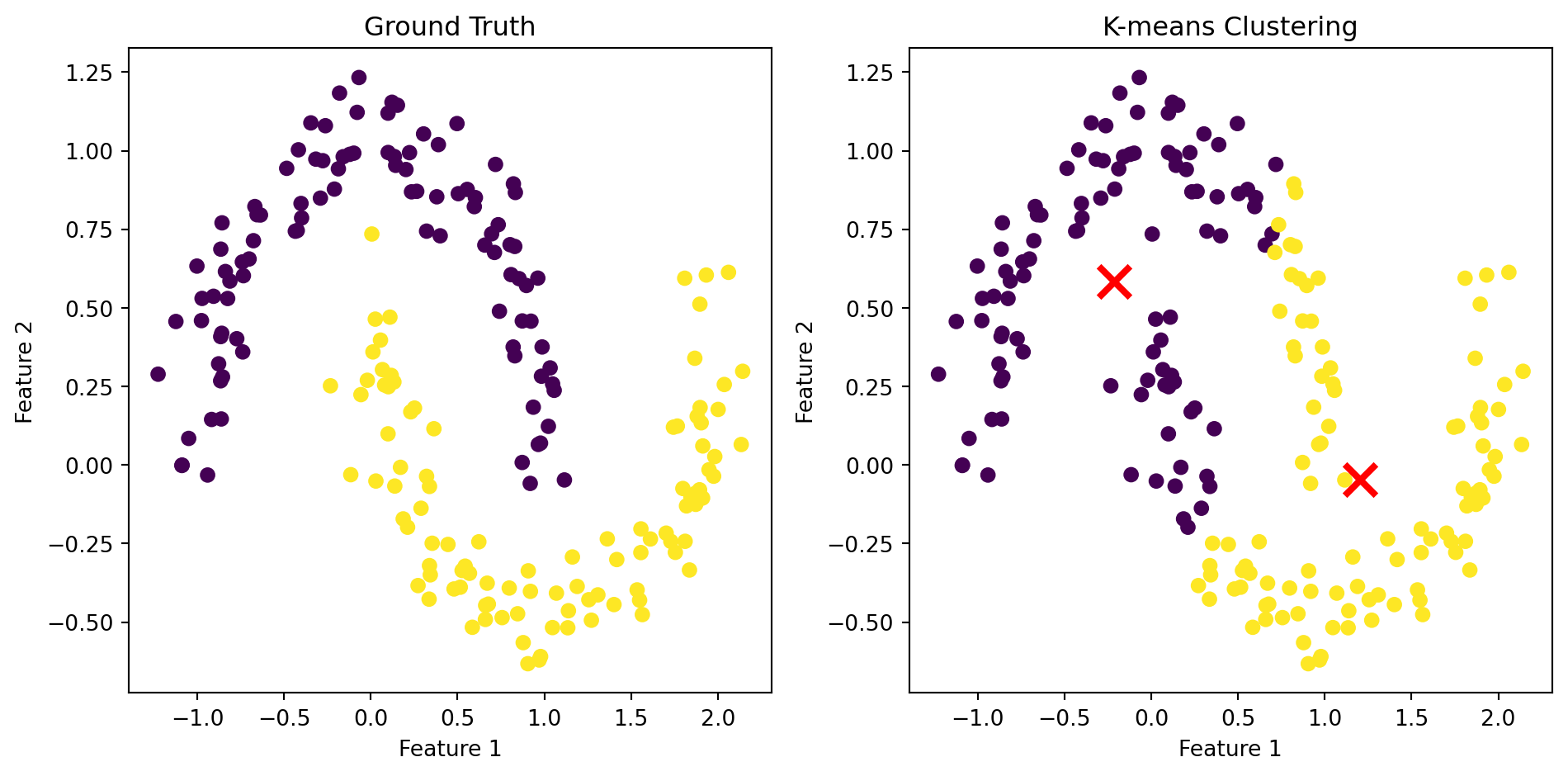 # Author: Phil Roth <mr.phil.roth@gmail.com># Arturo Amor <david-arturo.amor-quiroz@inria.fr># License: BSD 3 clause## From https://scikit-learn.org/stable/auto_examples/cluster/plot_kmeans_assumptions.htmlimport numpy as npfrom sklearn.datasets import make_moonsimport matplotlib.pyplot as pltfrom sklearn.cluster import KMeans# Generate two half-moon clustersX_moons, y_moons_true = make_moons(n_samples=200, noise=0.1, random_state=42)# Perform k-means clusteringkmeans = KMeans(n_clusters=2, random_state=42)y_moons_pred = kmeans.fit_predict(X_moons)# Create a figure with two subplots side by sidefig, (ax1, ax2) = plt.subplots(1, 2, figsize=(10, 5))# Plot ground truthax1.scatter(X_moons[:, 0], X_moons[:, 1], c=y_moons_true, cmap='viridis')ax1.set_title('Ground Truth')ax1.set_xlabel('Feature 1')ax1.set_ylabel('Feature 2')# Plot k-means clustering resultax2.scatter(X_moons[:, 0], X_moons[:, 1], c=y_moons_pred, cmap='viridis')ax2.set_title('K-means Clustering')ax2.set_xlabel('Feature 1')ax2.set_ylabel('Feature 2')# Add cluster centers to the k-means plotax2.scatter(kmeans.cluster_centers_[:, 0], kmeans.cluster_centers_[:, 1], marker='x', s=200, linewidths=3, color='r', zorder=10)plt.tight_layout()plt.show()