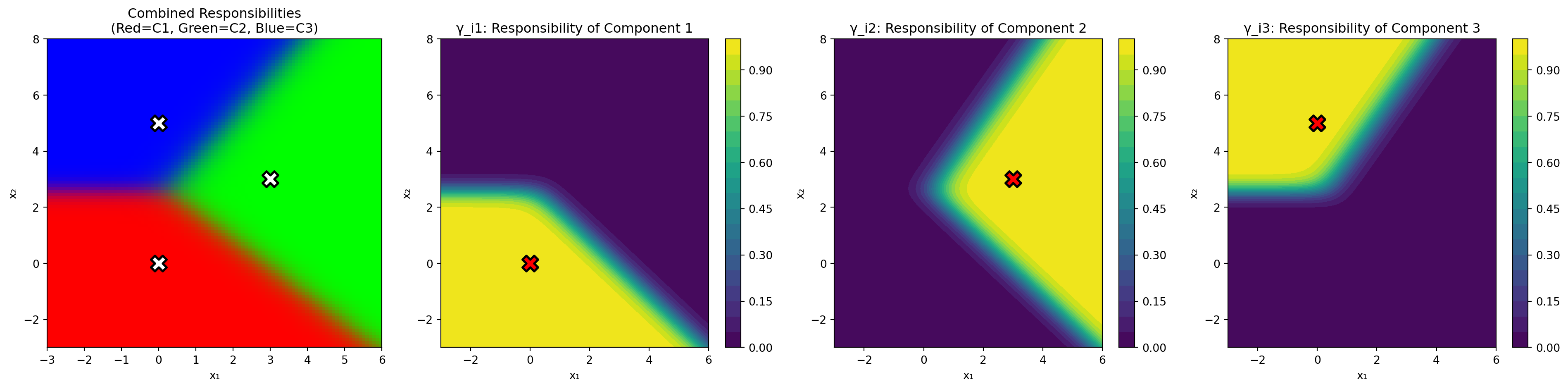 import matplotlib.pyplot as plt# Generate a grid of pointsx_range = np.linspace(-3, 6, 100)y_range = np.linspace(-3, 8, 100)X_grid, Y_grid = np.meshgrid(x_range, y_range)grid_points = np.column_stack([X_grid.ravel(), Y_grid.ravel()])# Compute responsibilities for each point on the gridresponsibilities = np.zeros((len(grid_points), 3))for i, point inenumerate(grid_points): likelihoods = np.array([ multivariate_normal.pdf(point, mean=mu[k], cov=Sigma[k])for k inrange(3) ]) numerators = pi * likelihoods denominator = np.sum(numerators) responsibilities[i] = numerators / denominator# Reshape for plottinggamma_1 = responsibilities[:, 0].reshape(X_grid.shape)gamma_2 = responsibilities[:, 1].reshape(X_grid.shape)gamma_3 = responsibilities[:, 2].reshape(X_grid.shape)# Create RGB image where each color represents a clusterrgb_image = np.zeros((X_grid.shape[0], X_grid.shape[1], 3))rgb_image[:, :, 0] = gamma_1 # Red for cluster 1rgb_image[:, :, 1] = gamma_2 # Green for cluster 2rgb_image[:, :, 2] = gamma_3 # Blue for cluster 3# Plotfig, axes = plt.subplots(1, 4, figsize=(20, 5))# RGB combined viewaxes[0].imshow(rgb_image, extent=[x_range[0], x_range[-1], y_range[0], y_range[-1]], origin='lower', aspect='auto')axes[0].scatter(mu[:, 0], mu[:, 1], c='white', s=200, marker='X', edgecolors='black', linewidths=2)axes[0].set_title('Combined Responsibilities\n(Red=C1, Green=C2, Blue=C3)', fontsize=12)axes[0].set_xlabel('x₁')axes[0].set_ylabel('x₂')# Individual responsibility mapsfor k inrange(3): gamma_k = responsibilities[:, k].reshape(X_grid.shape) im = axes[k+1].contourf(X_grid, Y_grid, gamma_k, levels=20, cmap='viridis') axes[k+1].scatter(mu[k, 0], mu[k, 1], c='red', s=200, marker='X', edgecolors='black', linewidths=2) axes[k+1].set_title(f'γ_i{k+1}: Responsibility of Component {k+1}', fontsize=12) axes[k+1].set_xlabel('x₁') axes[k+1].set_ylabel('x₂') plt.colorbar(im, ax=axes[k+1])plt.tight_layout()plt.show()