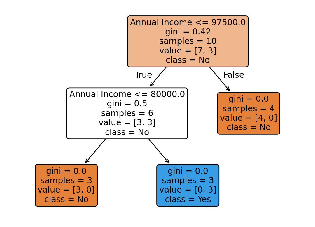 We see that the left node (Home Owner == Yes) has a 0% error rate since all the samples are Defaulted == No. We don’t split this node since all the samples are of the same class. We call this node a leaf node and we’ll color it orange.
