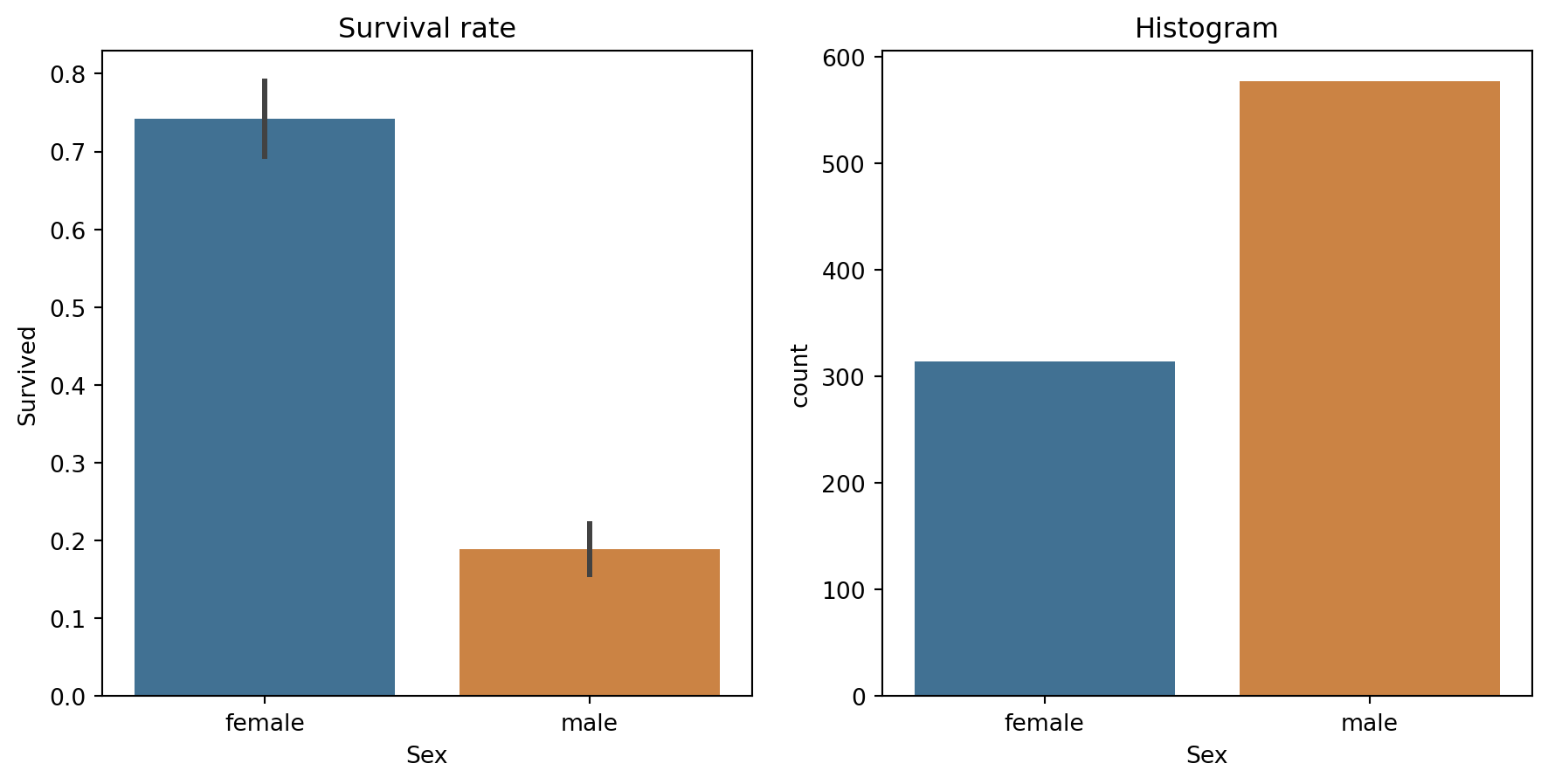 dep="Survived" # Dependent variableLet’s explore some fields starting with survival rate by gender.