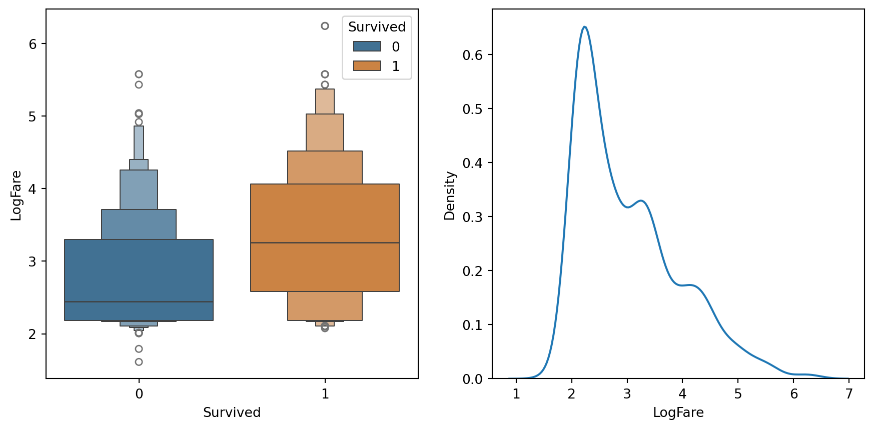 The boxenplot above shows quantiles of LogFare for each group of Survived==0 and Survived==1.