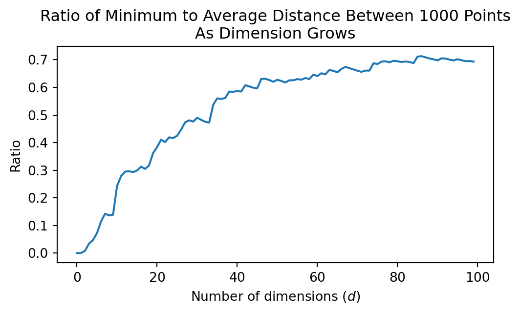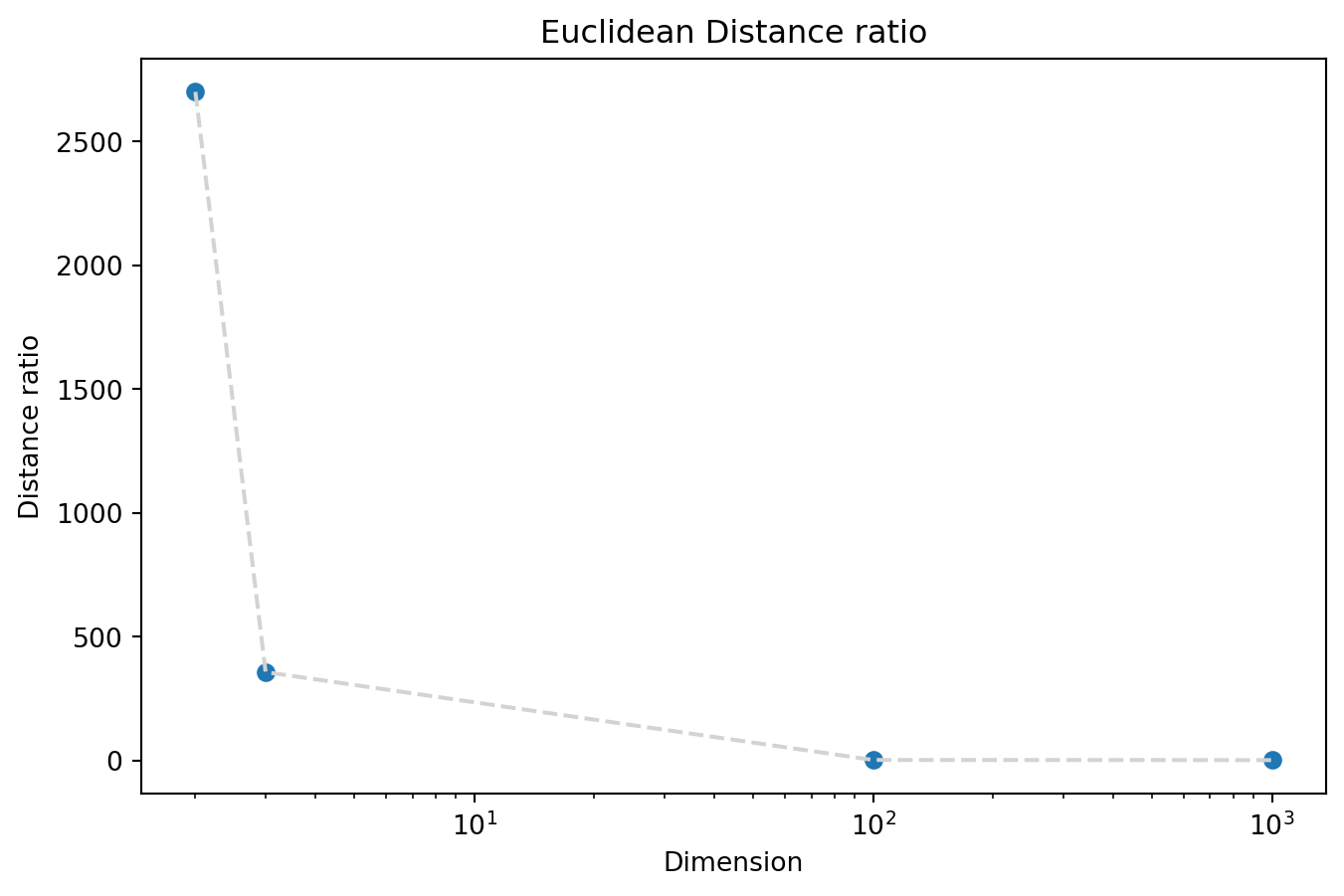 Let’s generate 1000 normally distributed points in 2D, 3D, 100D, and 1000D and look at the ratio of the largest to smallest distance between points.