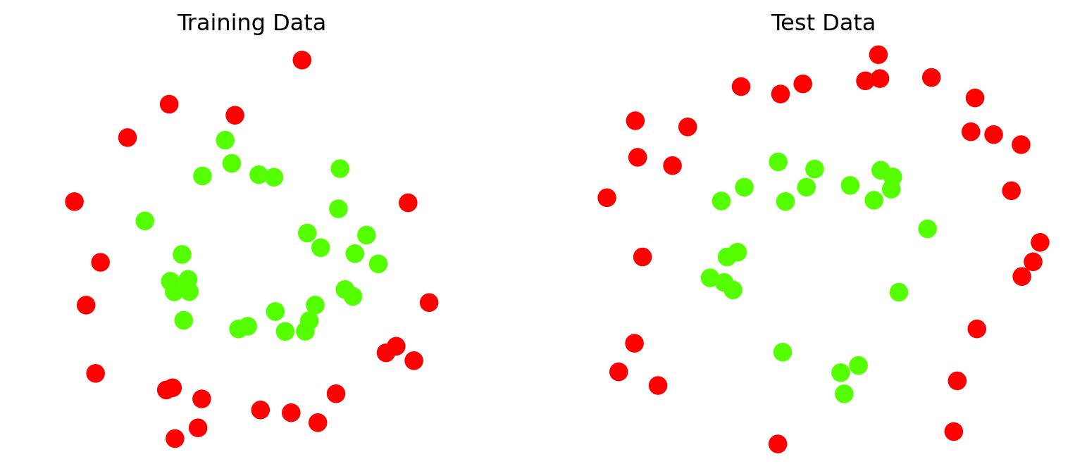 X_train = X[:50]y_train = y[:50]X_test = X[50:]y_test = y[50:]plt.figure(figsize = (10, 4))plt.subplot(1, 2, 1)plt.scatter(X_train[:, 0], X_train[:, 1], c = y_train, s =80)plt.axis('equal')plt.axis('off')plt.title('Training Data')plt.subplot(1, 2, 2)plt.scatter(X_test[:, 0], X_test[:, 1], c = y_test, s =80)plt.title('Test Data')plt.axis('equal')plt.axis('off')plt.show()