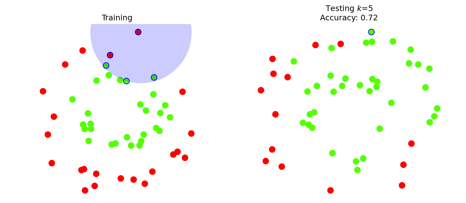 k=5test_point = np.argmax(X_test[:, 1])neighbors = knn5.kneighbors([X_test[test_point]])[1]plt.figure(figsize = (10, 4))plt.subplot(1, 2, 1)plt.scatter(X_train[:, 0], X_train[:, 1], c = y_train, s =80)plt.scatter(X_train[neighbors,0], X_train[neighbors,1], c = y_train[neighbors], marker='o', facecolors='none', edgecolors='b', s =80)radius = np.max(metrics.euclidean_distances(X_test[test_point].reshape(1, -1), X_train[neighbors][0]))ax = plt.gcf().gca()circle = mp.patches.Circle(X_test[test_point], radius, facecolor ='blue', alpha =0.2)ax.add_artist(circle)plt.axis('equal')plt.axis('off')plt.tight_layout()plt.title(r'Training')plt.subplot(1, 2, 2)plt.scatter(X_test[:, 0], X_test[:, 1], c = y_pred_test, s =80)plt.scatter(X_test[test_point, 0], X_test[test_point, 1], marker='o', facecolors='none', edgecolors='b', s =80)plt.title('Testing $k$={}\nAccuracy: {}'.format(k,knn5.score(X_test, y_test)))plt.axis('equal')plt.axis('off')plt.show()