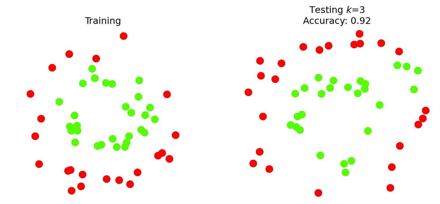 k =3knn3 = KNeighborsClassifier(n_neighbors=k) knn3.fit(X_train,y_train)y_pred_test = knn3.predict(X_test)plt.figure(figsize = (10, 4))plt.subplot(1, 2, 1)plt.scatter(X_train[:, 0], X_train[:, 1], c=y_train, s =80)plt.axis('equal')plt.axis('off')plt.title(r'Training')plt.subplot(1, 2, 2)plt.scatter(X_test[:, 0], X_test[:, 1], c=y_pred_test, s =80)plt.title(f'Testing $k$={k}\nAccuracy: {knn3.score(X_test, y_test)}')plt.axis('off')plt.axis('equal')plt.show()