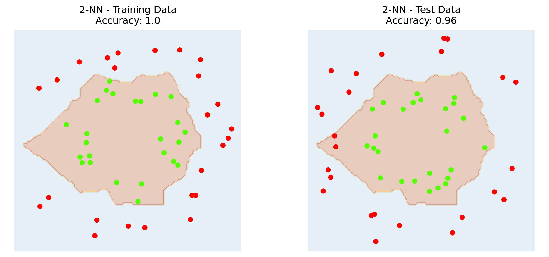 Here is the decision boundary for \(k\)-NN with \(k = 2\).