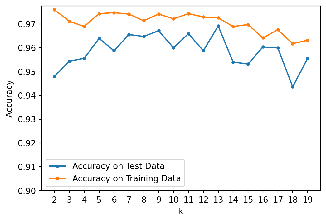 plt.figure(figsize= (6, 4))accy = np.array(acc)stds = np.array(std)/np.sqrt(nreps)print(f'Max Test Accuracy at k = {kvals[np.argmax(accy[:, 0])]} with accuracy {np.max(accy[:, 0]):.03f}')plt.plot(kvals, accy[:, 0], '.-', label ='Accuracy on Test Data')plt.plot(kvals, accy[:, 1], '.-', label ='Accuracy on Training Data')plt.xlabel('k')plt.ylabel('Accuracy')plt.ylim(0.9, None)plt.xticks(kvals)plt.legend(loc ='best')plt.show()