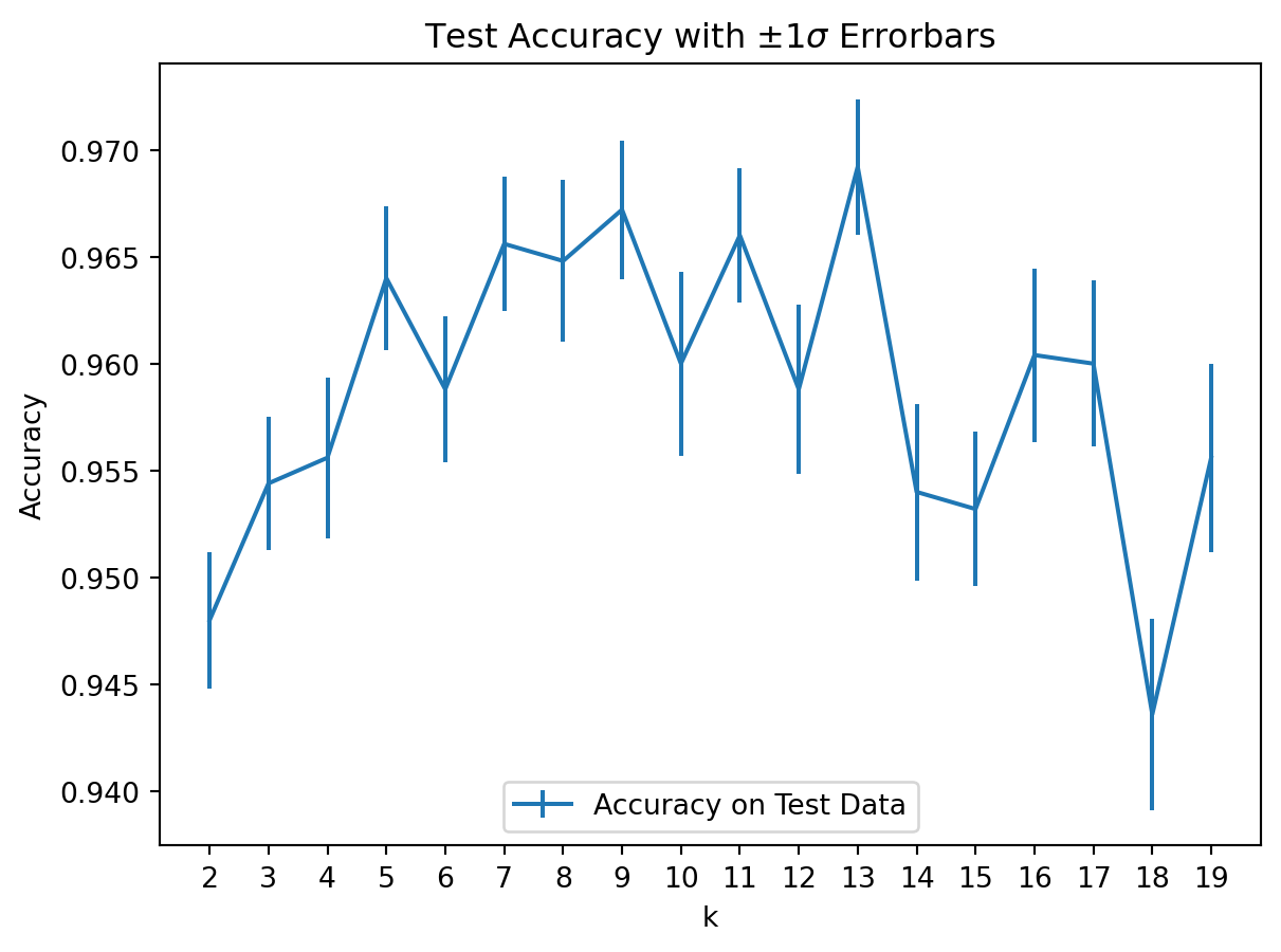 plt.errorbar(kvals, accy[:, 0], stds[:, 0], label ='Accuracy on Test Data')plt.xlabel('k')plt.ylabel('Accuracy')plt.legend(loc ='lower center')plt.xticks(kvals)plt.title(r'Test Accuracy with $\pm 1\sigma$ Errorbars')plt.show()
