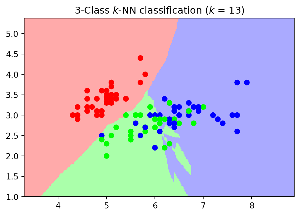 # Create color mapsfrom matplotlib.colors import ListedColormapcmap_light = ListedColormap(['#FFAAAA', '#AAFFAA', '#AAAAFF'])cmap_bold = ListedColormap(['#FF0000', '#00FF00', '#0000FF'])# we will use only the first two (of four) features, so we can visualizeX = X_train[:, :2] h =.02# step size in the meshk =13knn = KNeighborsClassifier(n_neighbors=k)knn.fit(X, y_train)# Plot the decision boundary. For that, we will assign a color to each# point in the mesh [x_min, x_max]x[y_min, y_max].x_min, x_max = X[:, 0].min() -1, X[:, 0].max() +1y_min, y_max = X[:, 1].min() -1, X[:, 1].max() +1xx, yy = np.meshgrid(np.arange(x_min, x_max, h), np.arange(y_min, y_max, h))Z = knn.predict(np.c_[xx.ravel(), yy.ravel()])# Put the result into a color plotZ = Z.reshape(xx.shape)plt.figure(figsize=(6, 4))plt.pcolormesh(xx, yy, Z, cmap=cmap_light, shading='auto')# Plot also the training pointsplt.scatter(X[:, 0], X[:, 1], c=y_train, cmap=cmap_bold)plt.xlim(xx.min(), xx.max())plt.ylim(yy.min(), yy.max())plt.title(f"3-Class $k$-NN classification ($k$ = {k})")plt.show()