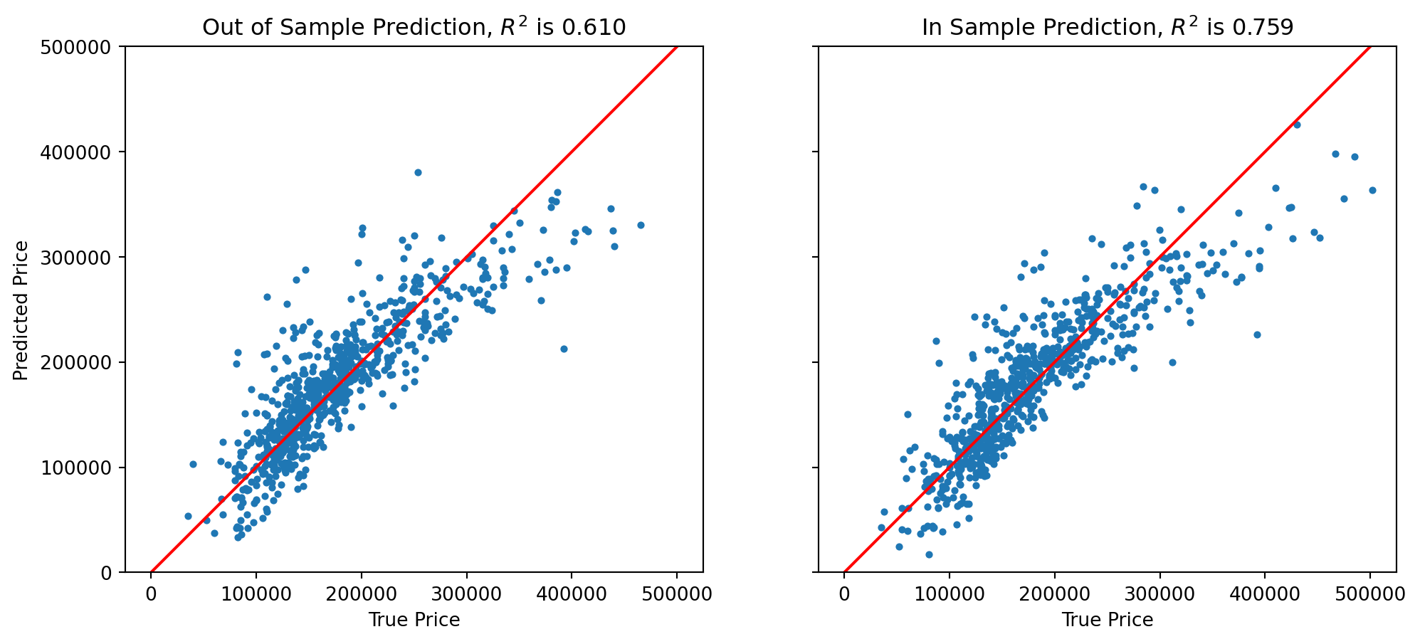Note that the \(R^2\) on the (held out) test data is 0.610.