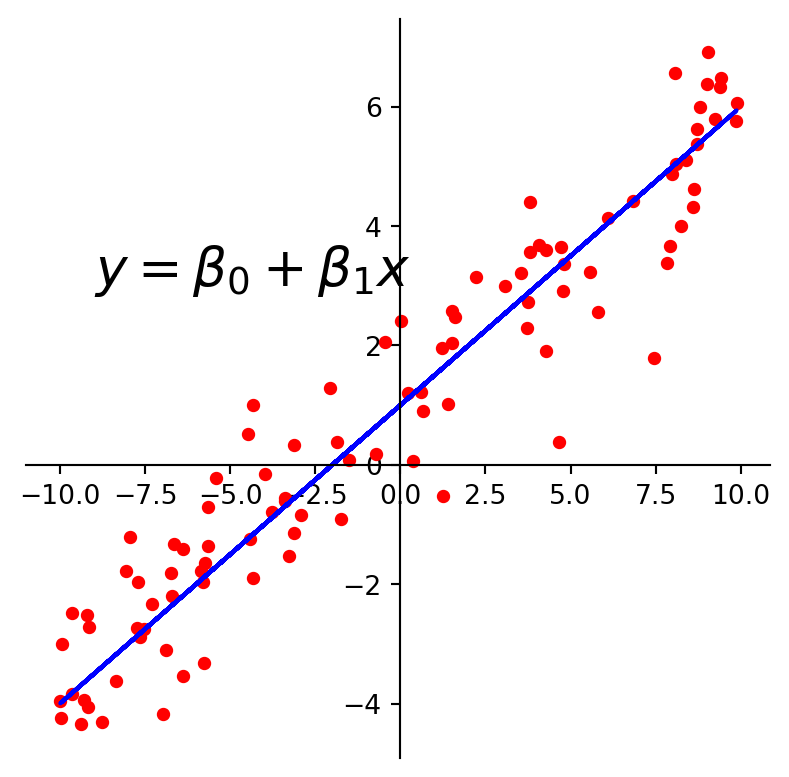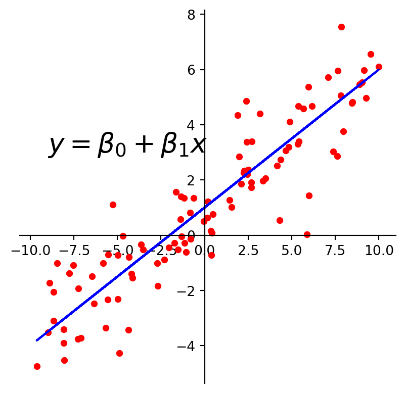 plt.text(-9, 3, r'$y = \beta_0 + \beta_1x$', size=20)