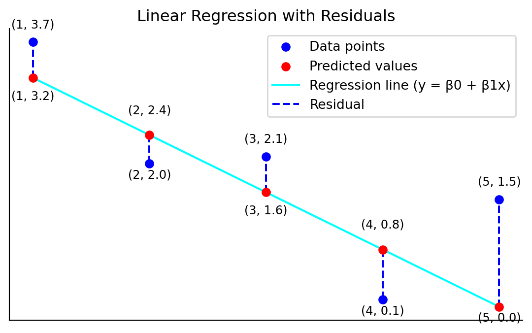 ax.vlines(x[i], y_line[i], y[i], color='blue', linestyles='dashed', label='Residual' if i == 0 else "", zorder=2)