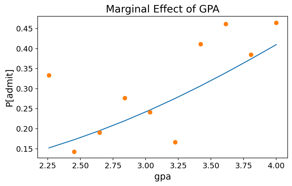 Let’s look at how each independent variable affects admission probability by plotting the mean admission probability as a function of the independent variable.